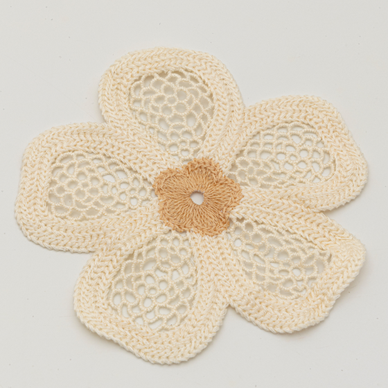 O aplique de flor tem 13,50 cm, é um tipo de crochê elegante e encorpado, amplamente usado em acabamentos e detalhes que valorizam o visual de peças de moda e decoração.