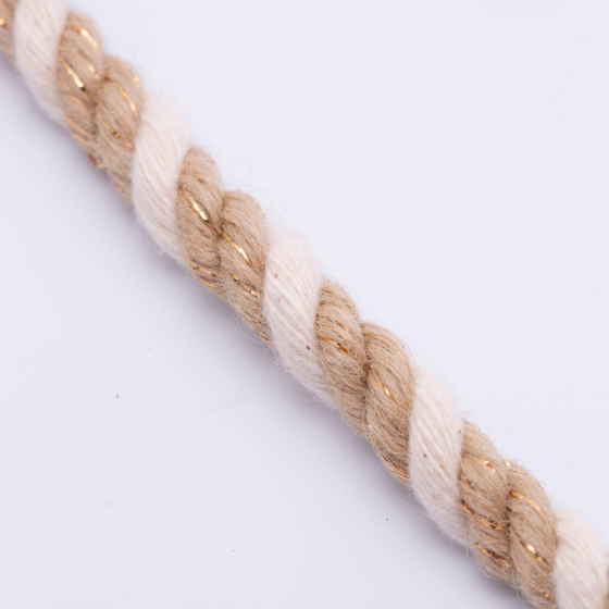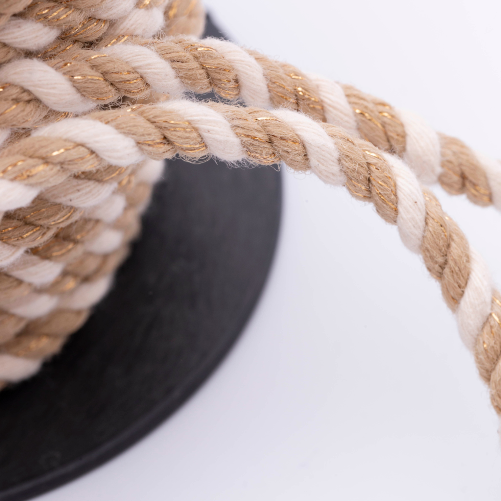 Pacote com 50 metros - cordão torcido decorativo, feito com dois fios de fibras naturais em tons neutros, sendo que um deles tem fios dourados metálicos entrelaçados.
