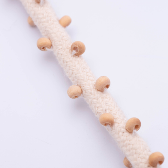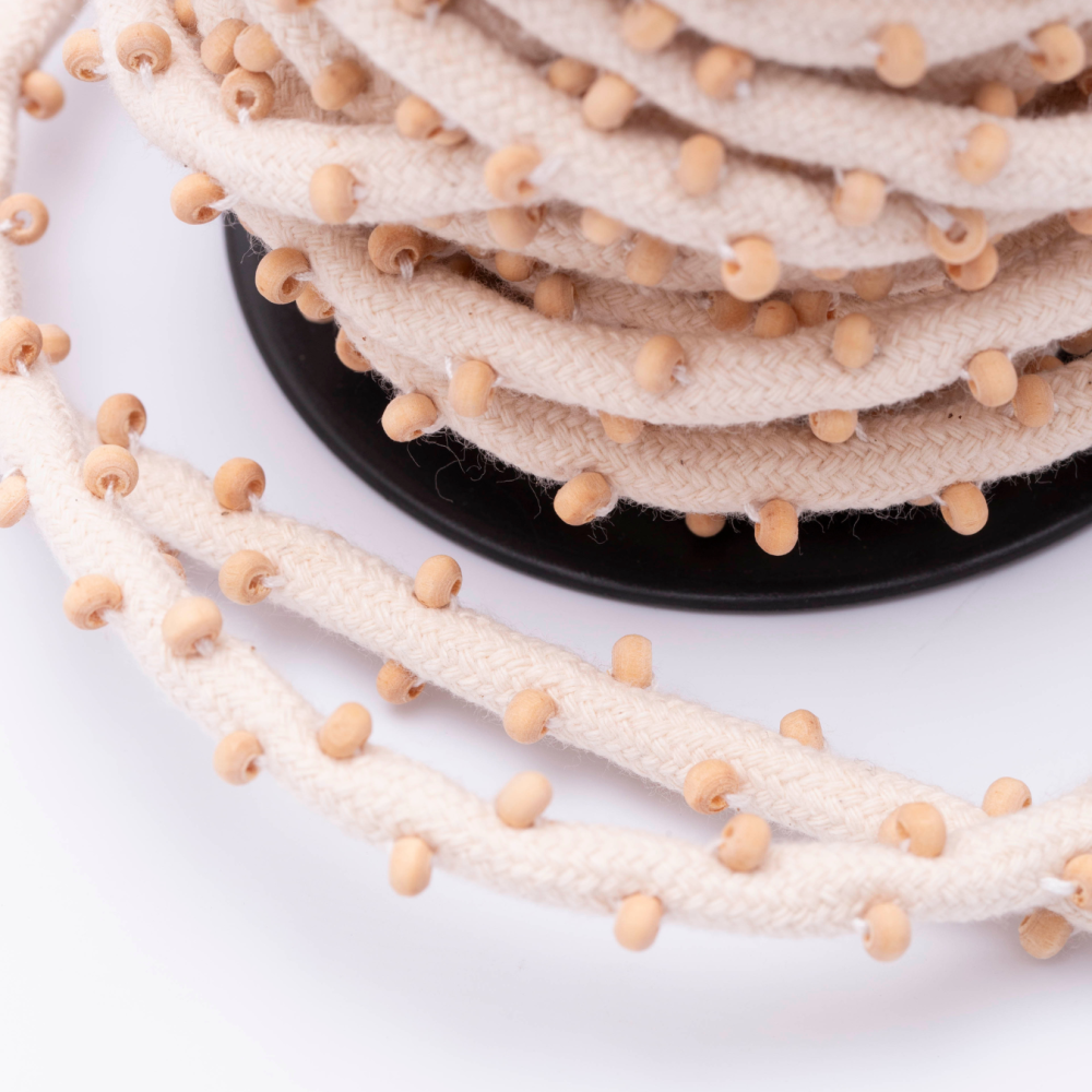 Pacote com 50 metros - cordão de tecido trançado de cor bege claro (cru), com pequenas contas de madeira presas ao longo do comprimento. O cordão tem textura de algodão e apresenta um padrão de trama espinha de peixe. As contas são de madeira natural, com coloração em tom claro amarelado, típicas de madeira sem acabamento ou com verniz fosco suave.