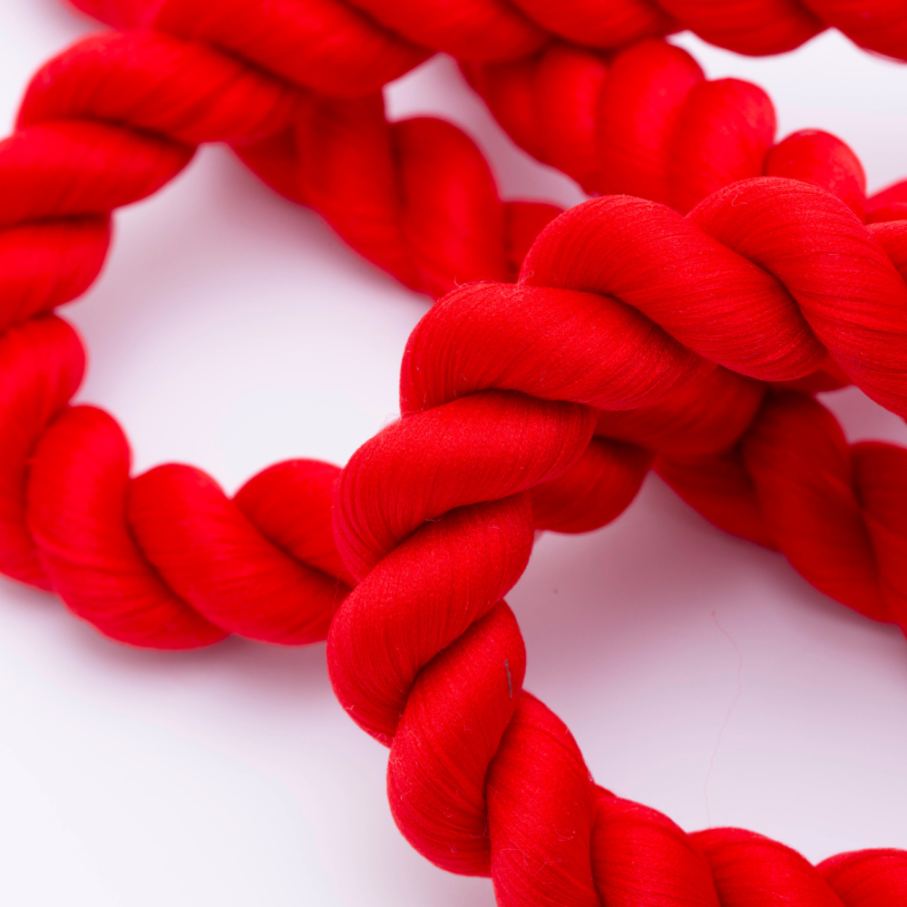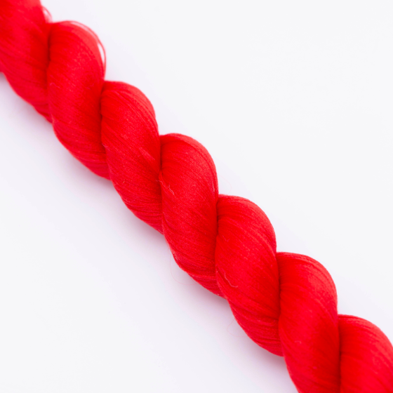 Pacote com 11 metros - cordão torcido de aparência sofisticada. O material é um tecido acetinado, de cor vermelha (tom quente), com fios entrelaçados ao longo da extensão, criando um efeito visual elegante e chamativo.