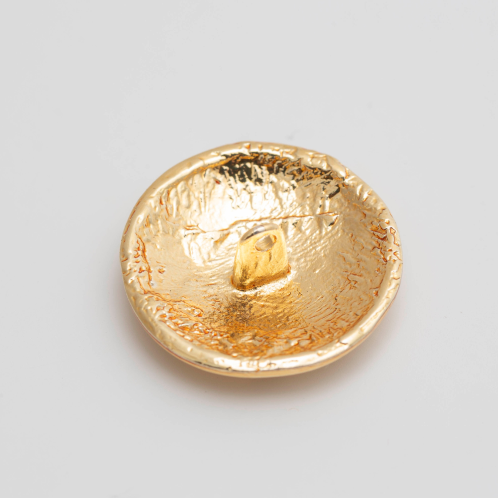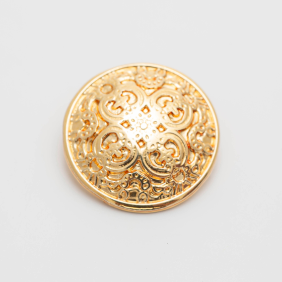 Botão metálico decorativo tamanho 0,36, com acabamento dourado brilhante e entalhes em alto-relevo que remetem a arabescos e ornamentos clássicos. Uma peça que une requinte e tradição, ideal para enriquecer peças com um toque de luxo atemporal.