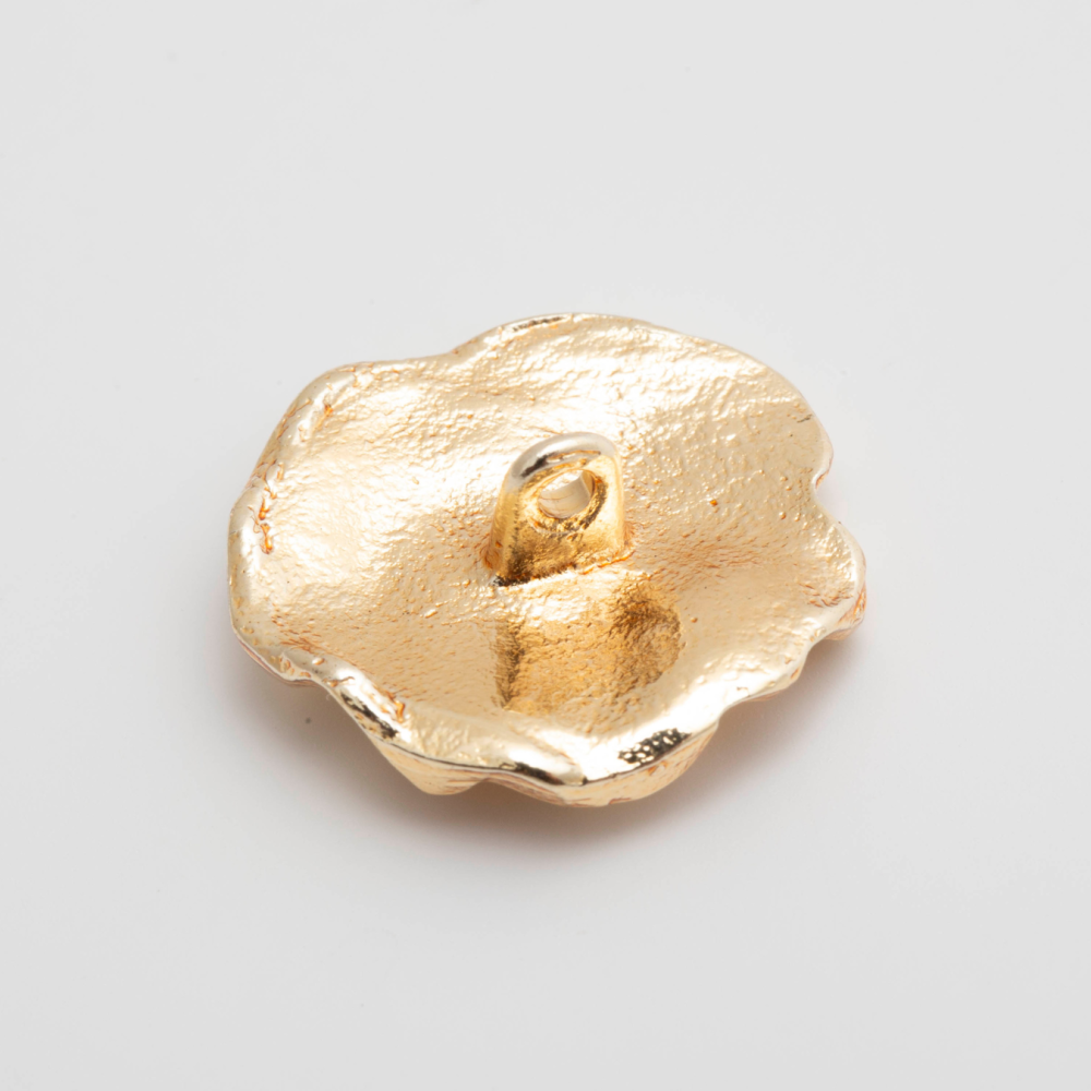 Botão metálico decorativo tamanho 0,26, com acabamento dourado brilhante. Uma peça que une requinte e tradição, ideal para enriquecer peças com um toque de luxo atemporal.