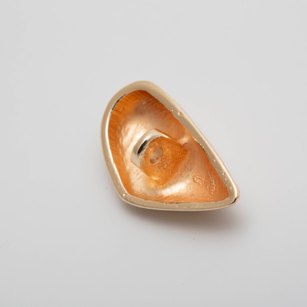 Botão concha metálico com acabamento em alto brilho dourado, formato redondo e superfície detalhadamente trabalhada com arabescos em relevo. O design ornamentado remete a elementos clássicos e sofisticados, ideal para dar um toque de elegância a peças de vestuário.