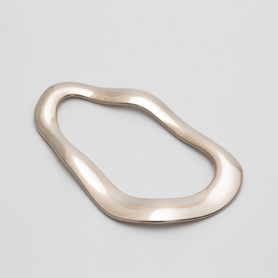 Peça metálica com design assimétrico e fluido, em formato ovalado com contorno ondulado. Possui acabamento prateado polido que confere sofisticação e modernidade. É um acessório versátil, usado tanto como elemento decorativo quanto funcional em roupas femininas, masculinas ou peças unissex.