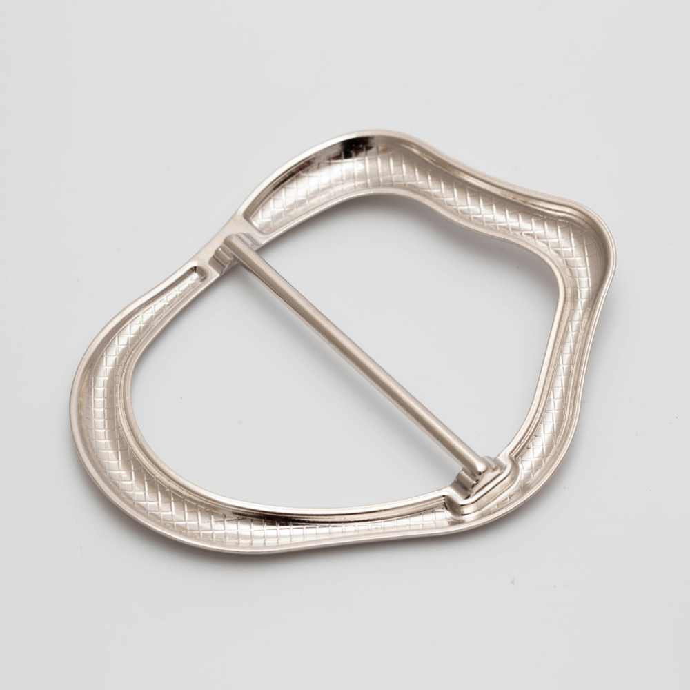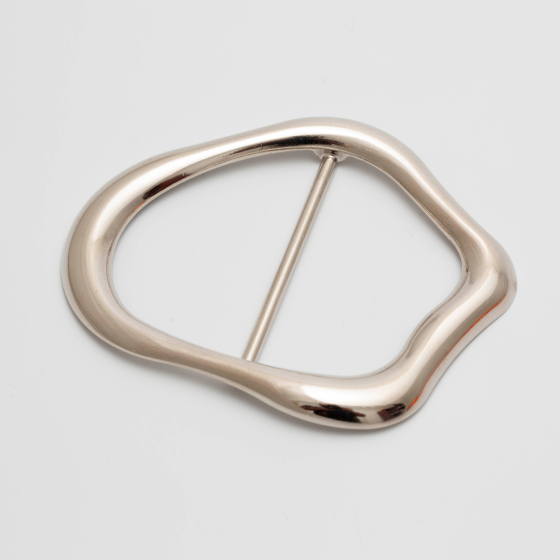 Acessório metálico com acabamento prateado e design orgânico e contemporâneo. Seu formato assimétrico e curvilíneo confere um ar sofisticado e moderno, ideal para quem busca aviamentos diferenciados em projetos de moda ou acessórios.