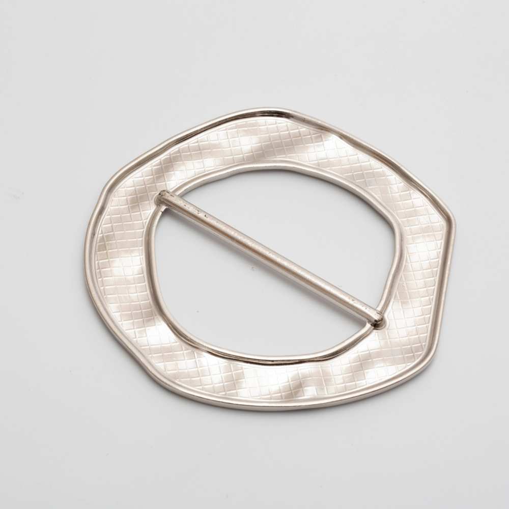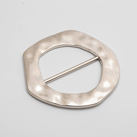 Passante para roupa com tamanho de 4,00 cm, que combina funcionalidade com um design moderno e levemente orgânico. A peça possui acabamento metálico liso com leve textura martelada e formato circular irregular, o que lhe confere um visual contemporâneo e sofisticado.