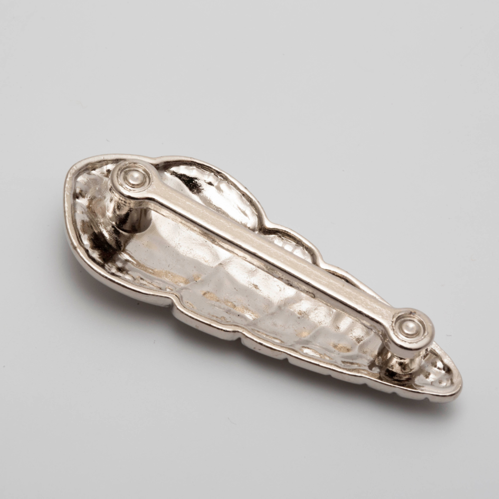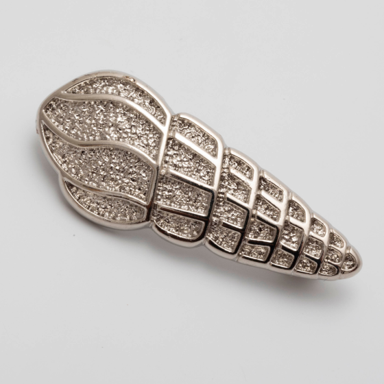 Acessório decorativo para roupa com tamanho de 2,80 cm, inspirado em um formato de sorvete em casquinha, mas com acabamento sofisticado prateado metálico texturizado, o que o transforma em um elemento de destaque com apelo fashion marcante.