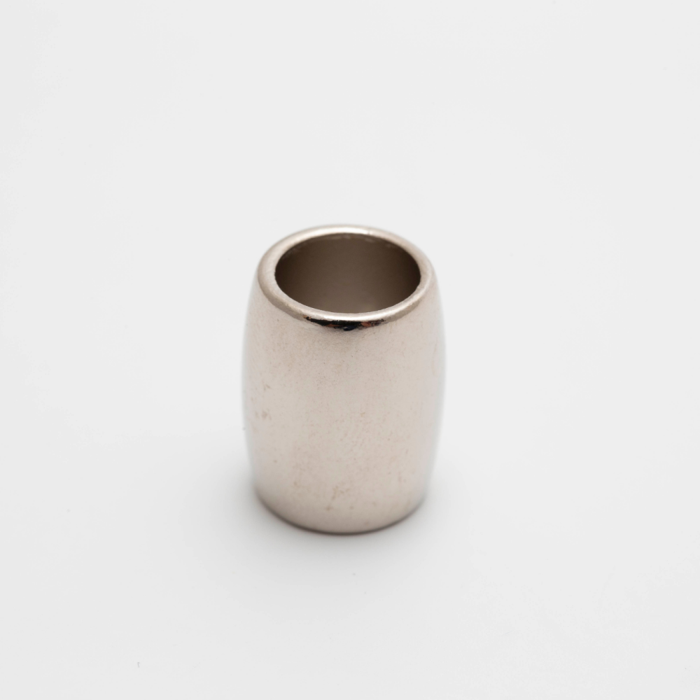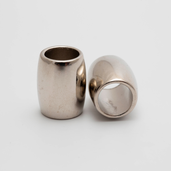 ponteira de cilindro de metal com banho níquel é um aviamento elegante e funcional, usado para dar acabamento sofisticado a peças de moda e acessórios.