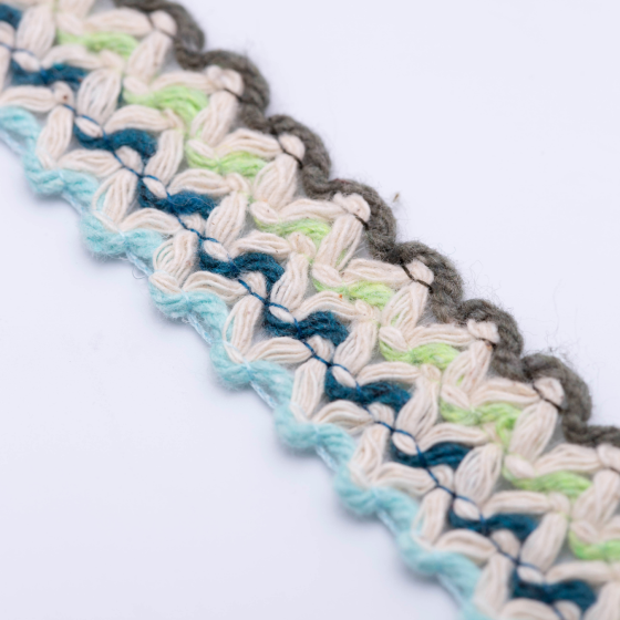 Renda artesanal em crochê, com tons mais frios e suaves, ideal para projetos com inspiração em natureza, frescor ou temas náuticos. A peça apresenta acabamento ondulado, textura rica e padrão repetitivo — excelente para aplicação em detalhes de moda e decoração.
