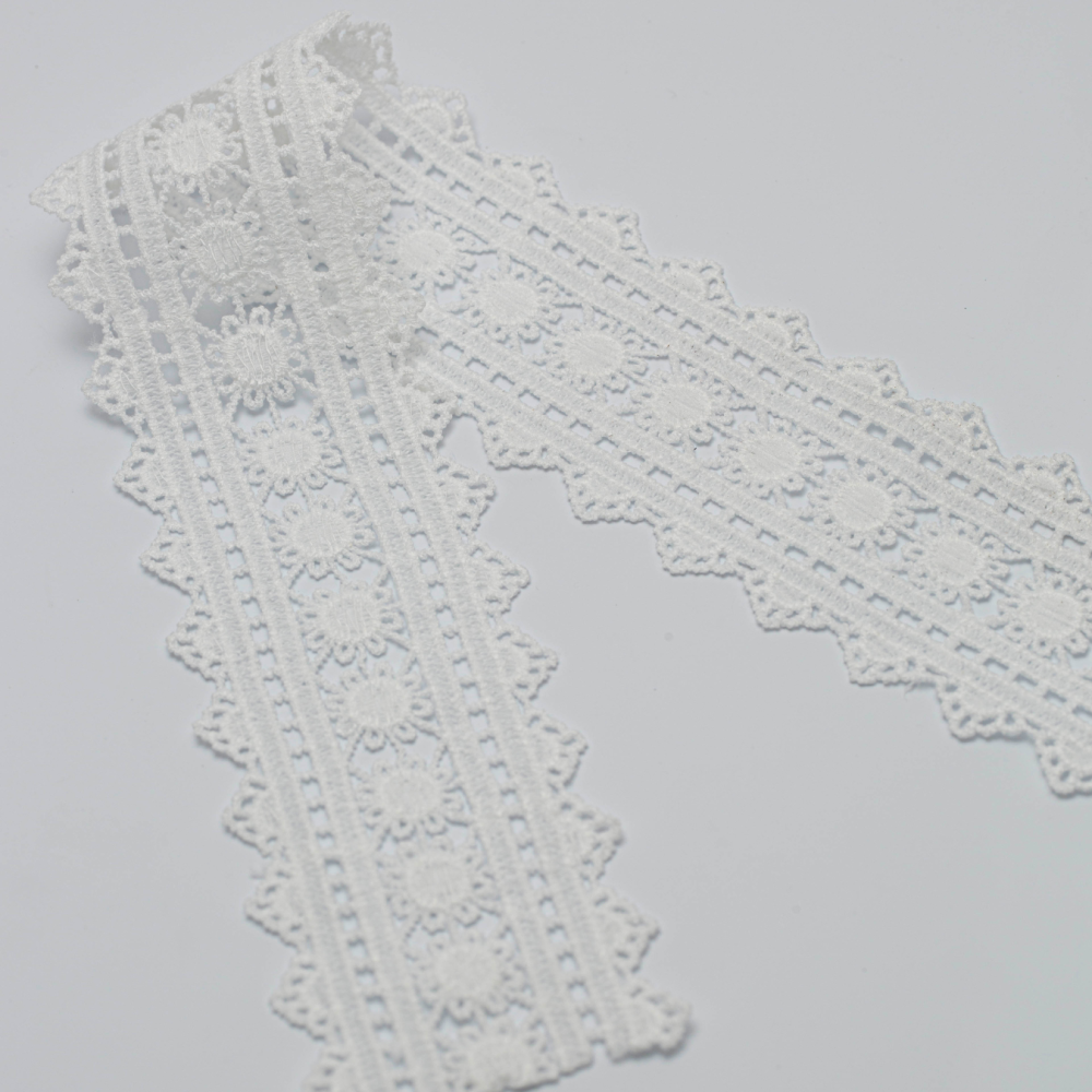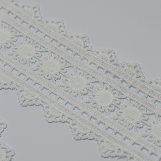 Renda Guipir Entremeio 5,50 cm é um tipo de renda elegante e encorpada, amplamente usada em acabamentos e detalhes que valorizam o visual de peças de moda e decoração.