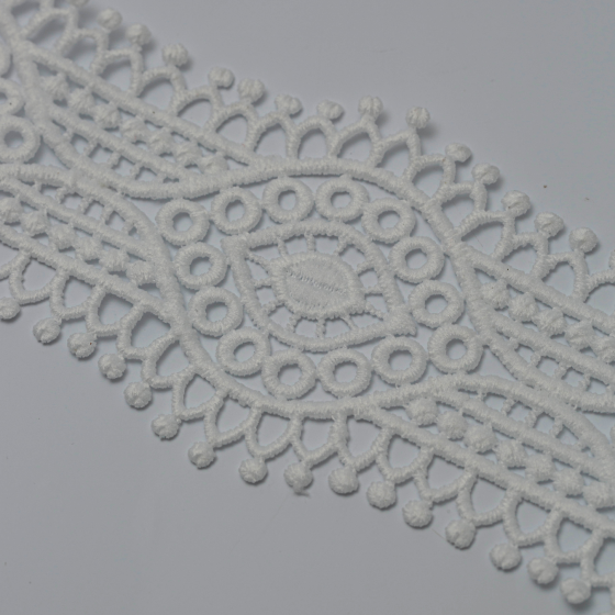 Renda Guipir tamanho 6,50 cm é um tipo de renda elegante e encorpada, amplamente usada em acabamentos e detalhes que valorizam o visual de peças de moda e decoração.