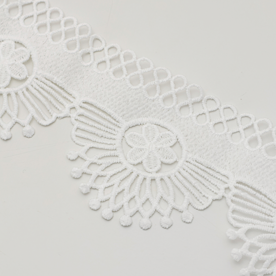 A Renda Guipir tem 7,60 cm, é um tipo de renda elegante e encorpada, amplamente usada em acabamentos e detalhes que valorizam o visual de peças de moda e decoração.