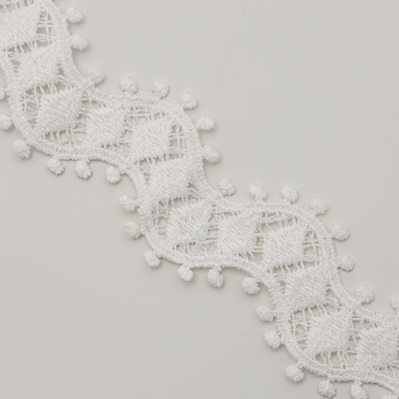 A Renda Guipir tem 2,50 cm, é um tipo de renda elegante e encorpada, amplamente usada em acabamentos e detalhes que valorizam o visual de peças de moda e decoração.