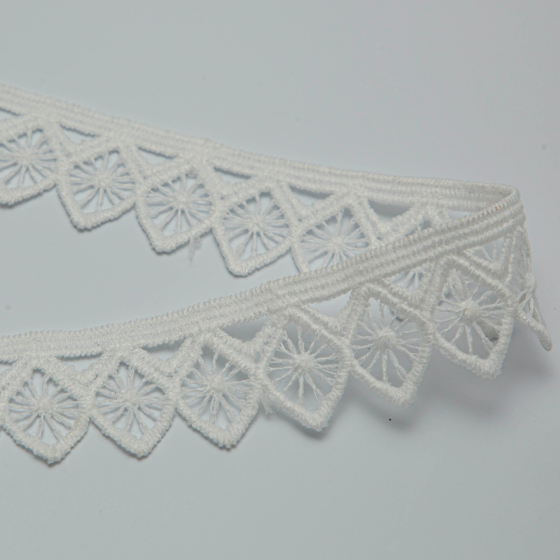 Renda Guipir Bico tamanho 2,40 cm é um tipo de renda elegante e encorpada, amplamente usada em acabamentos e detalhes que valorizam o visual de peças de moda e decoração.