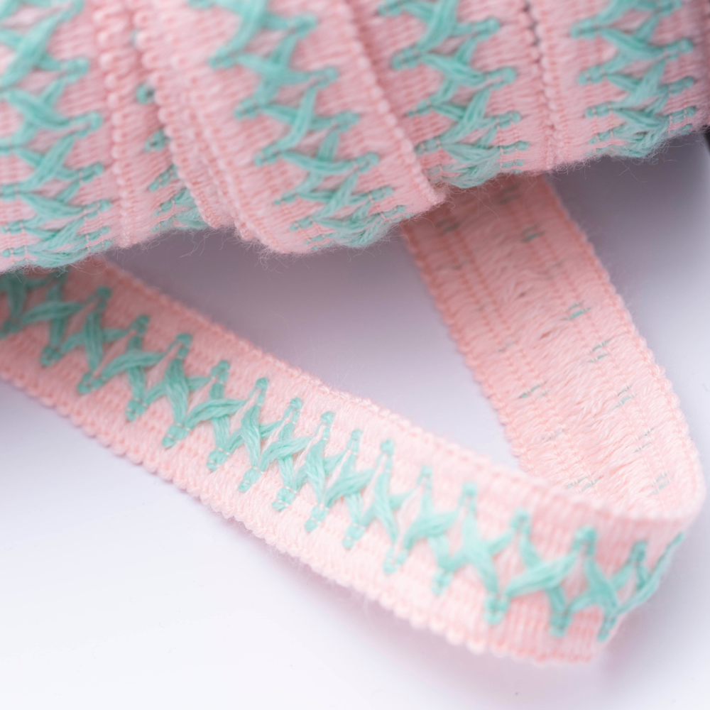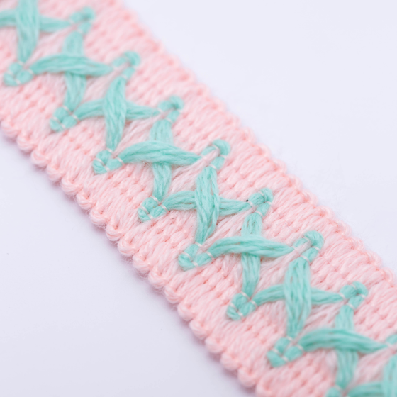Verde água: Cor do bordado em "X", que se destaca suavemente sobre o rosa.