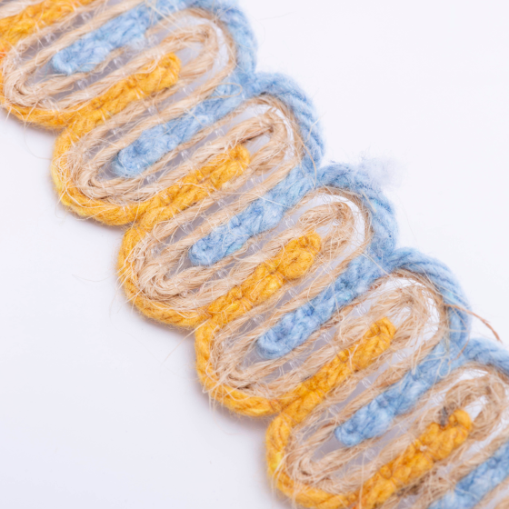 Essa peça é um tipo de renda artesanal decorativa, feita a partir de uma combinação harmoniosa de fios de algodão tingido e juta natural, numa proporção equilibrada de 50% algodão / 50% juta. Ela apresenta um design com curvas onduladas e repetições em zigue-zague, criando um visual rústico e, ao mesmo tempo, delicado.