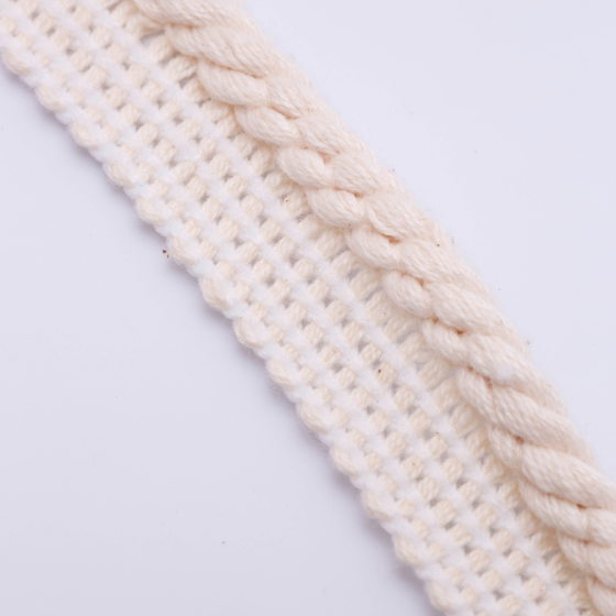Pacote com 50 metros - Este vivo apresenta um design artesanal que combina textura e estrutura, sendo ideal para acabamento ou aplicação decorativa em moda e design têxtil.