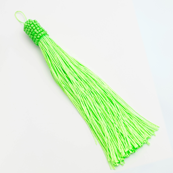 Pacote com 10 tassels na cor verde neon. Feito de fios agrupados e presos com uma faixa de miçangas na mesma cor, com um laço no topo para pendurar.