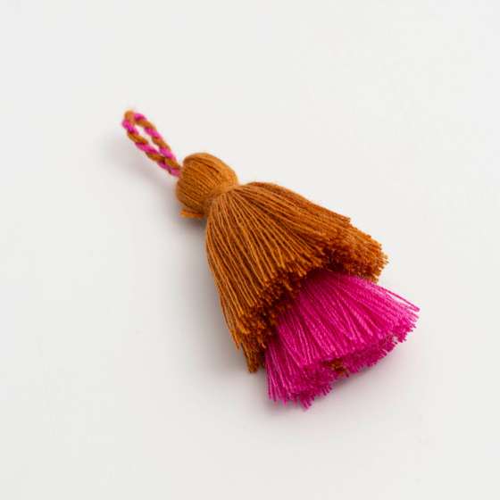 Caramelo / Mostarda escuro – Cor predominante na camada superior do tassel. Evoca aconchego, rusticidade e remete a elementos naturais como terra e madeira.