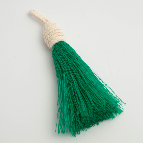 Pacote com 10 tassels com fios de cor verde bandeira na parte superior com corda bege ou cru.