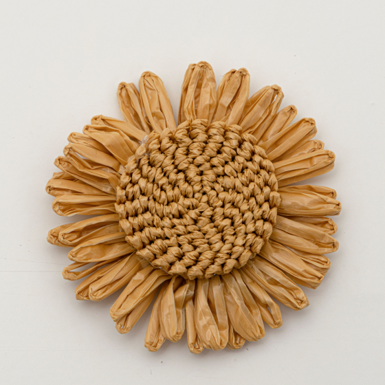 Flor de rafia tamanho 8,00 cm, ideal para aplicações em peças que exigem um acabamento delicado e funcional.