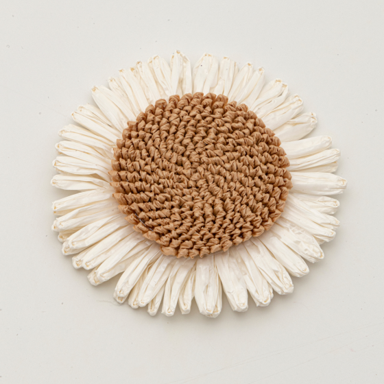 Flor de rafia tamanho 8,00 cm, ideal para aplicações em peças que exigem um acabamento delicado e funcional.
