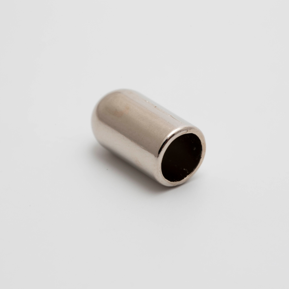 A ponteira de metal com banho níquel é um aviamento elegante e funcional, usado para dar acabamento sofisticado a peças de moda e acessórios.