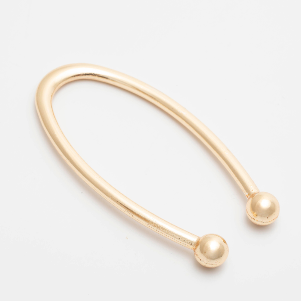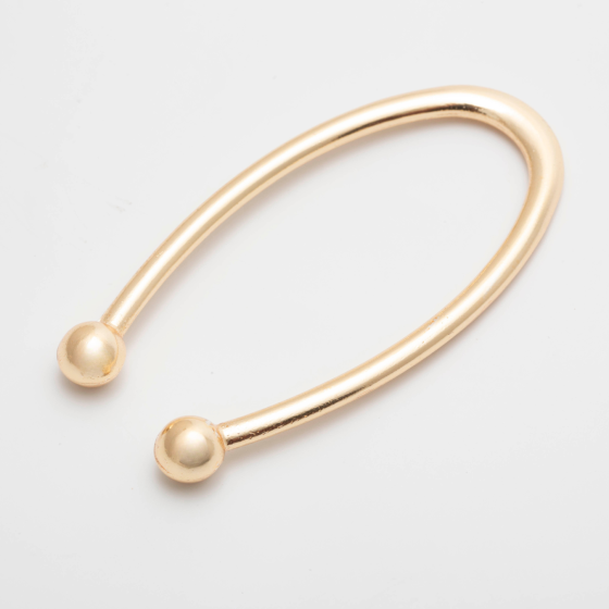Acessório metálico para roupa, no tamanho 6,00, possui acabamento dourado com design em formato de ferradura, finalizado com esferas nas extremidades. Ele é ideal para dar um toque sofisticado e moderno a peças de vestuário, sendo frequentemente utilizado como detalhe decorativo em cintos, alças, vestidos ou blusas com design diferenciado.